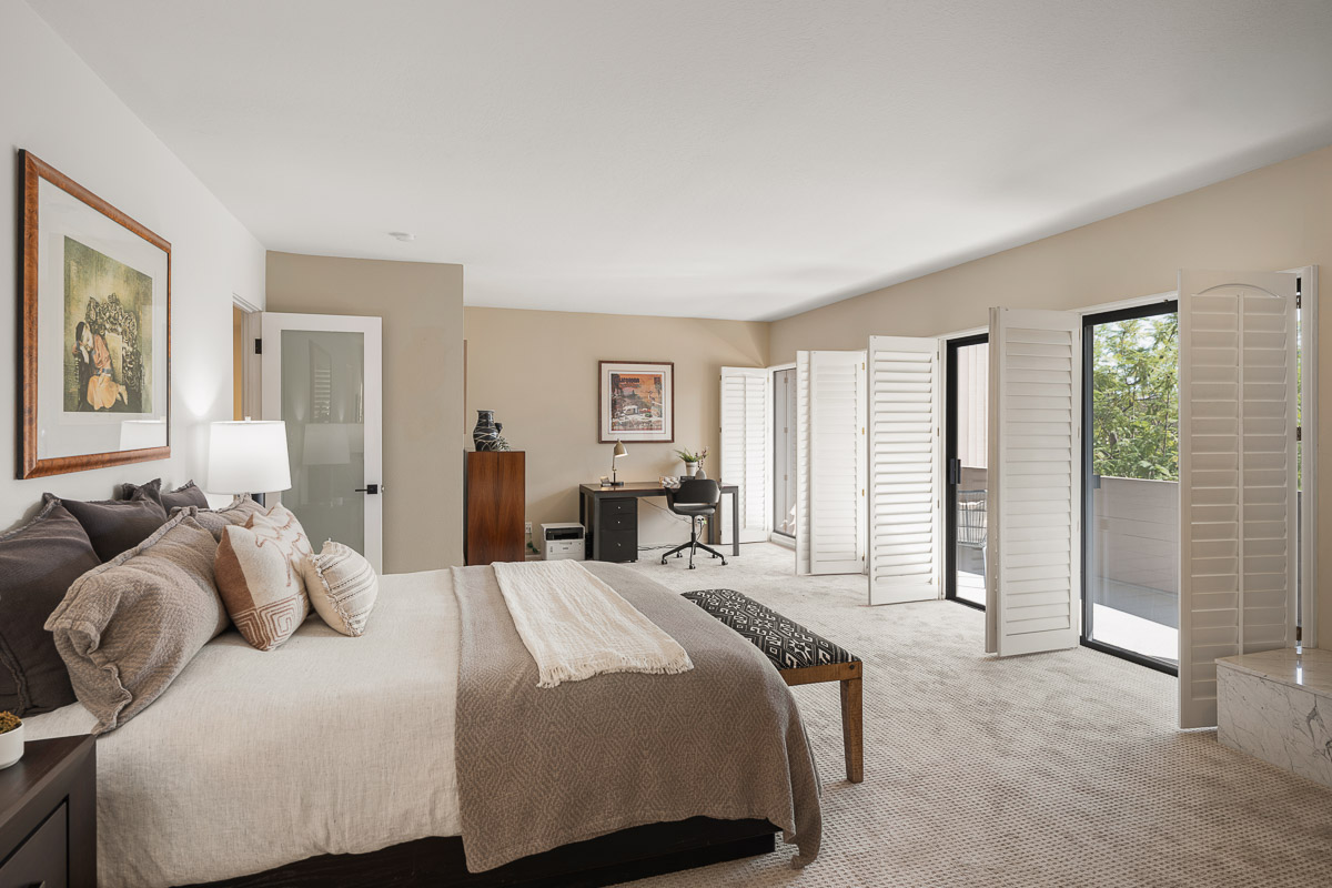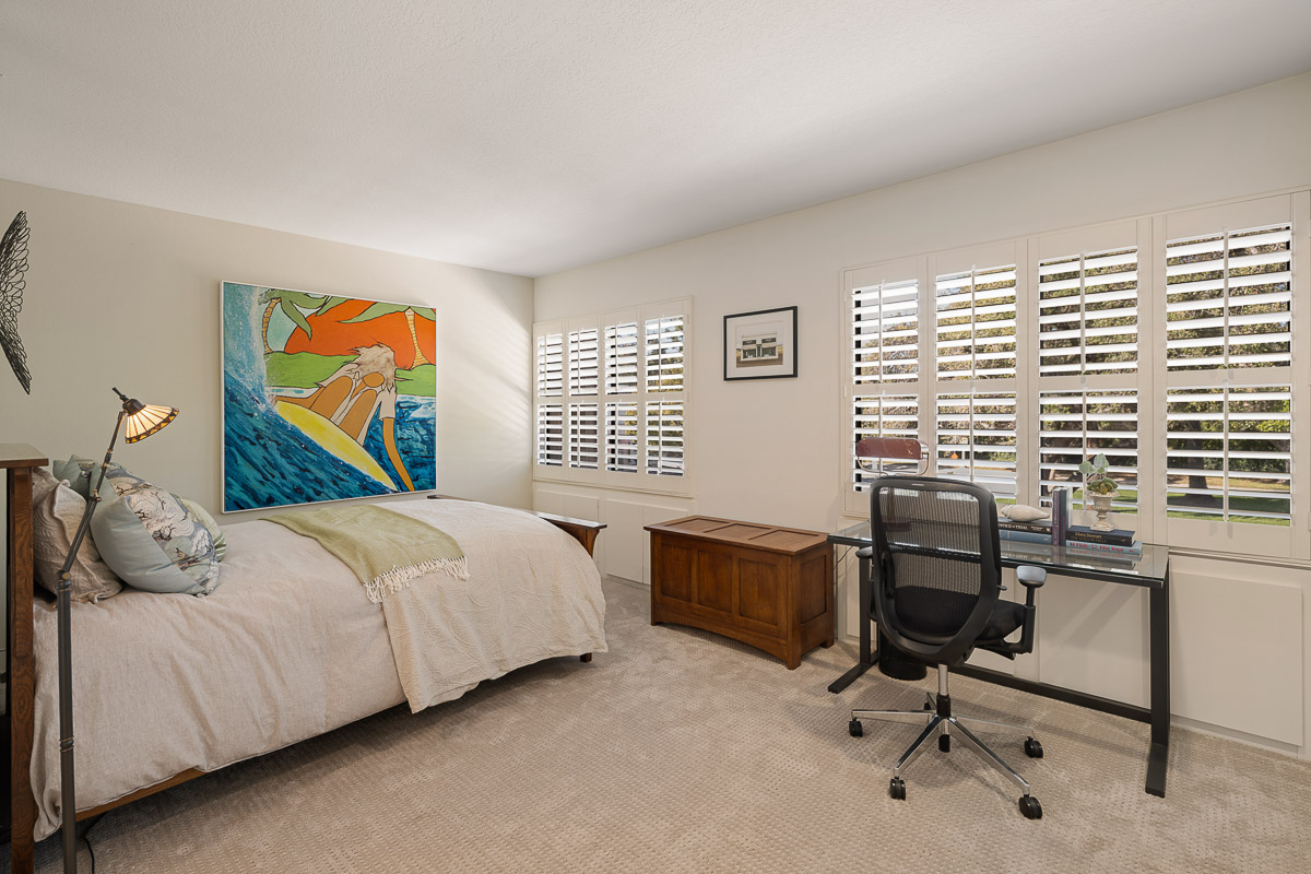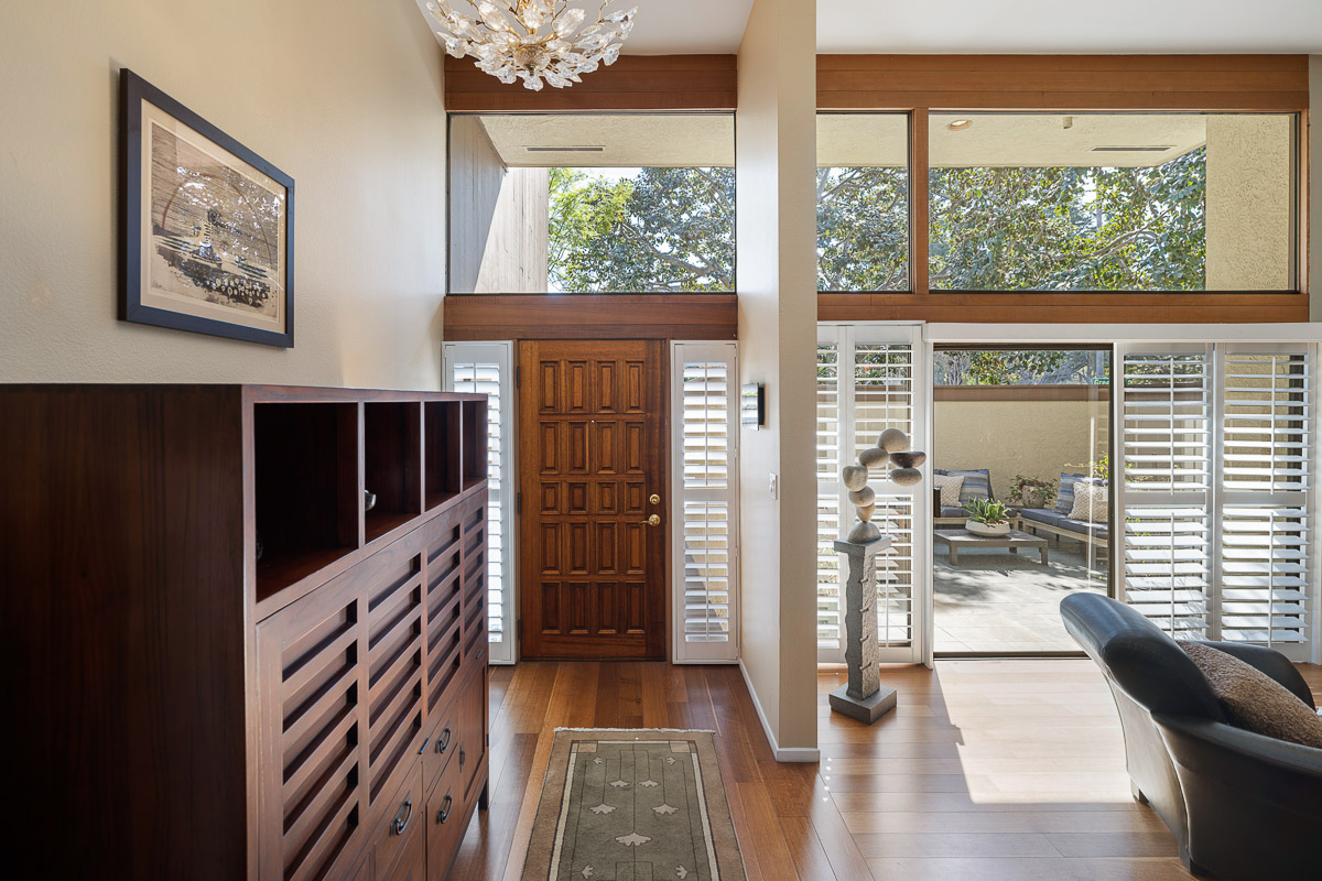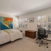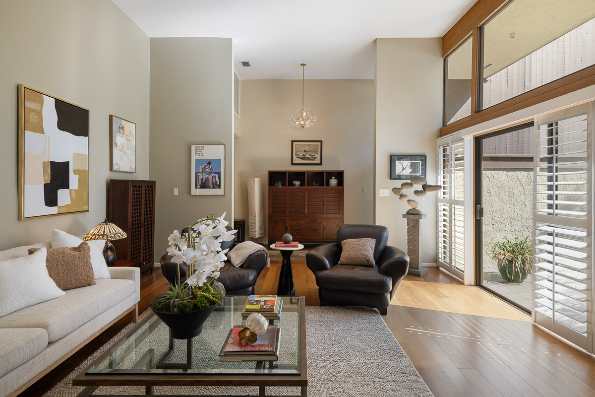 Step inside to find an expansive living room with soaring two-story ceilings, a stately, central fireplace and an adjoining, spacious patio that is ideal for entertaining friends, dining under the starts or simply relaxing with your morning coffee. The formal dining room opens to the remodeled kitchen with high-end appliances, a peninsula with seating and ample cabinet space. A cozy den has tall glass doors, that lead out to a wide side patio that overlooks the verdant Defender’s Park below. The space makes for a perfect reading nook, TV lounge, or home office. The sumptuous primary suite includes its own fireplace, a luxurious updated bath, a custom walk-in closet, and access to a second balcony with views that frame the natural surrounding beauty while offering zen-like privacy. The additional light-filled, bedroom offers an en-suite bath which is perfect for visiting guests.