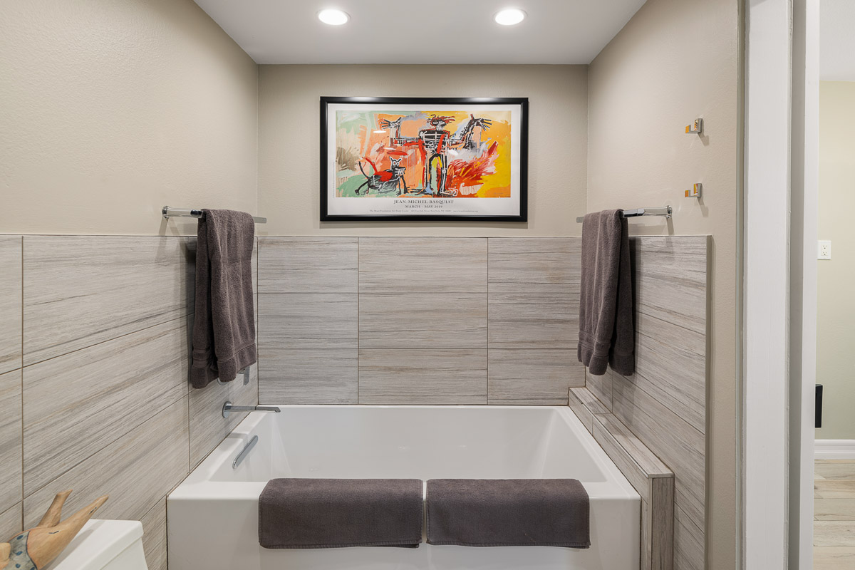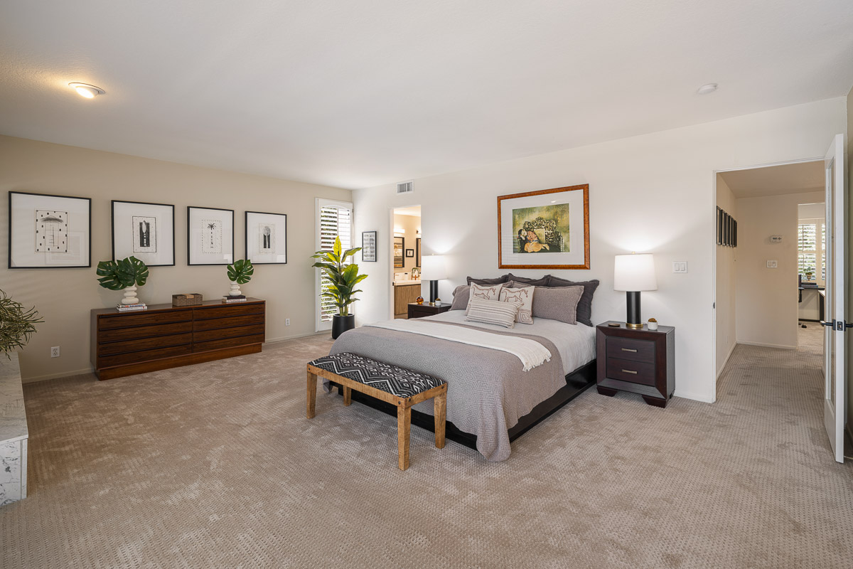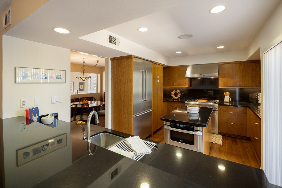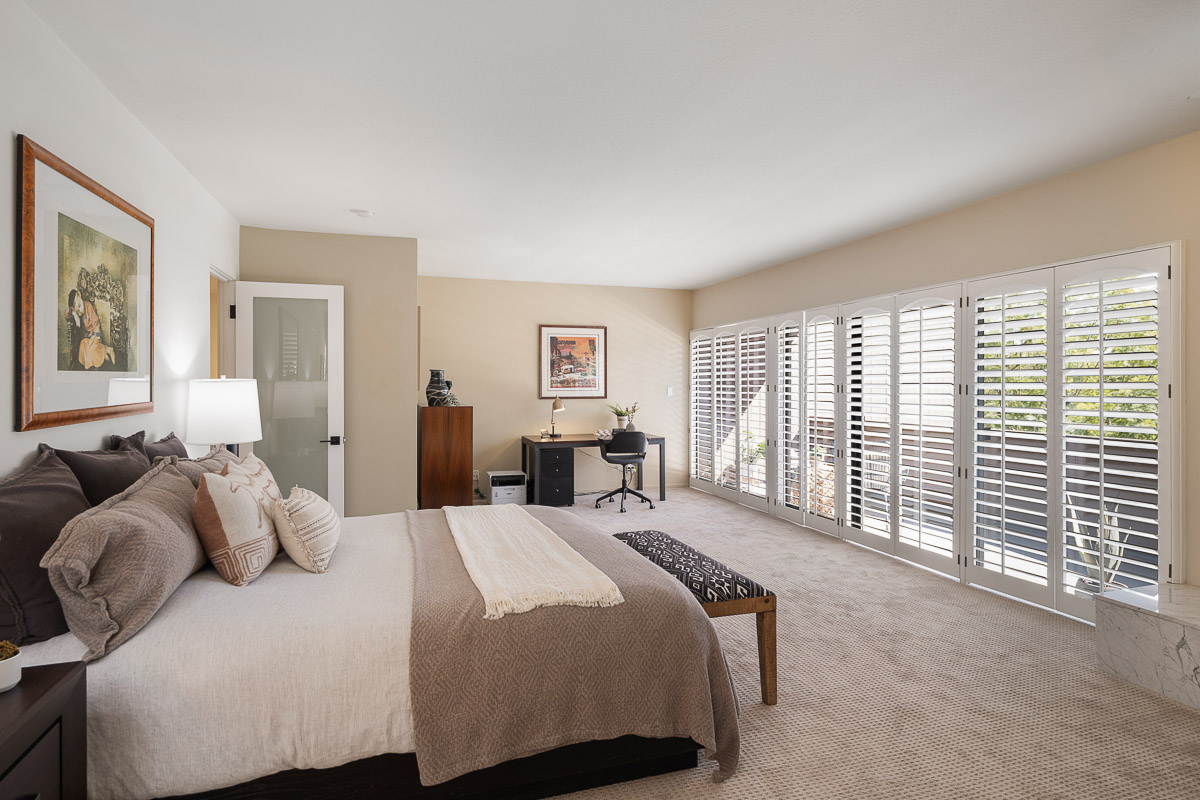 Step inside to find an expansive living room with soaring two-story ceilings, a stately, central fireplace and an adjoining, spacious patio that is ideal for entertaining friends, dining under the starts or simply relaxing with your morning coffee. The formal dining room opens to the remodeled kitchen with high-end appliances, a peninsula with seating and ample cabinet space. A cozy den has tall glass doors, that lead out to a wide side patio that overlooks the verdant Defender’s Park below. The space makes for a perfect reading nook, TV lounge, or home office. The sumptuous primary suite includes its own fireplace, a luxurious updated bath, a custom walk-in closet, and access to a second balcony with views that frame the natural surrounding beauty while offering zen-like privacy. The additional light-filled, bedroom offers an en-suite bath which is perfect for visiting guests.