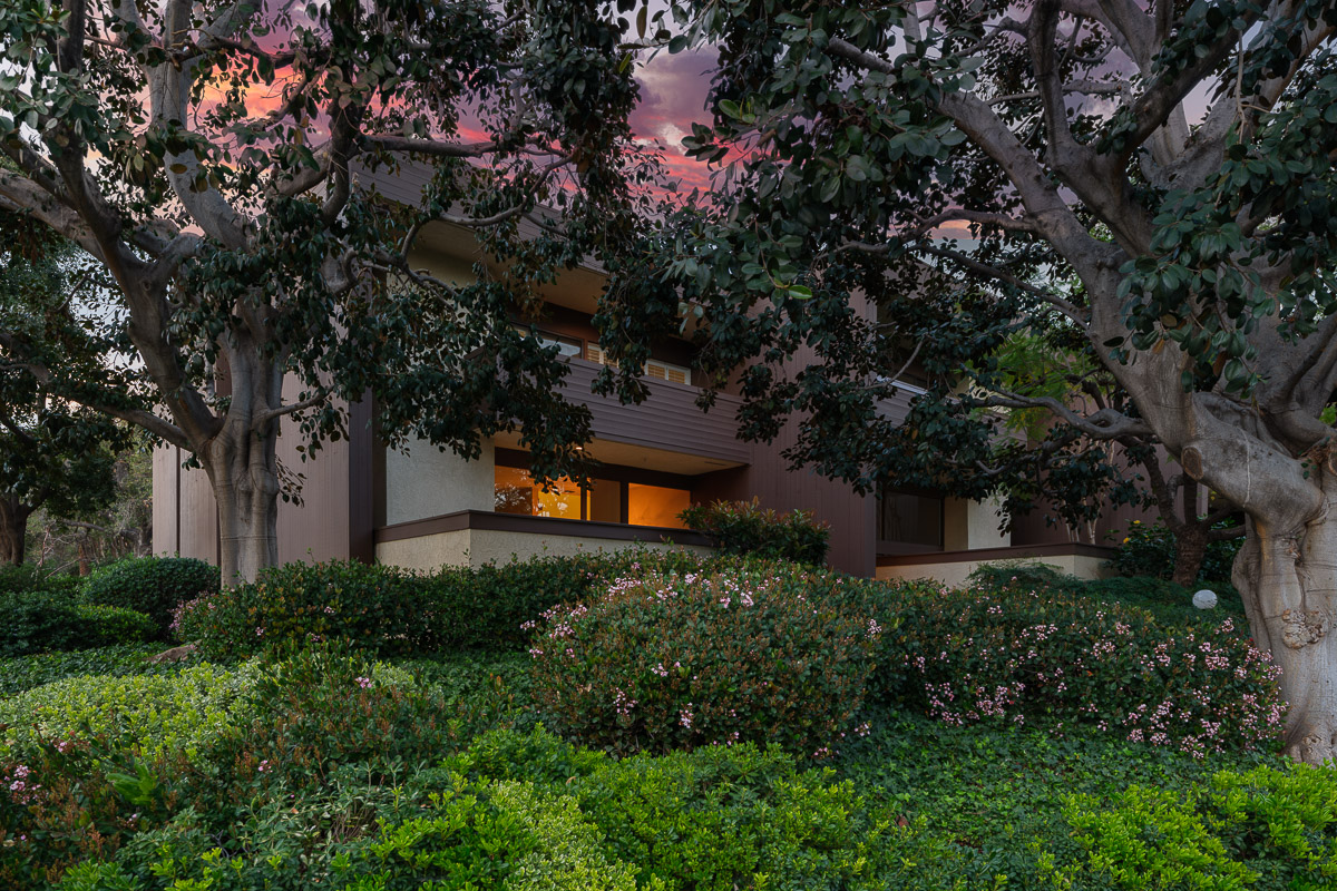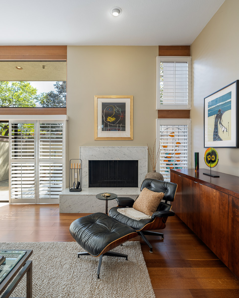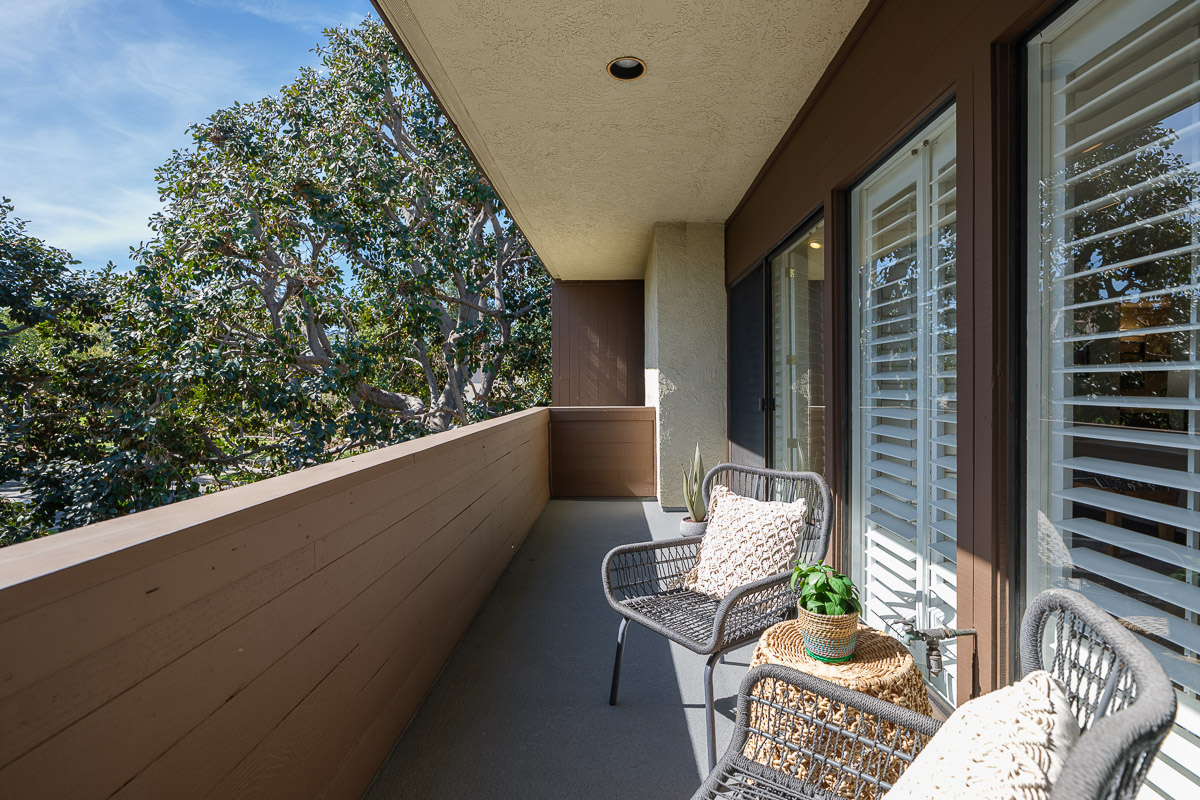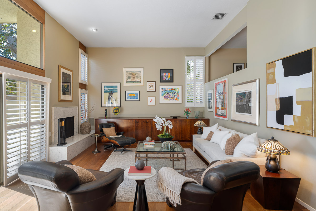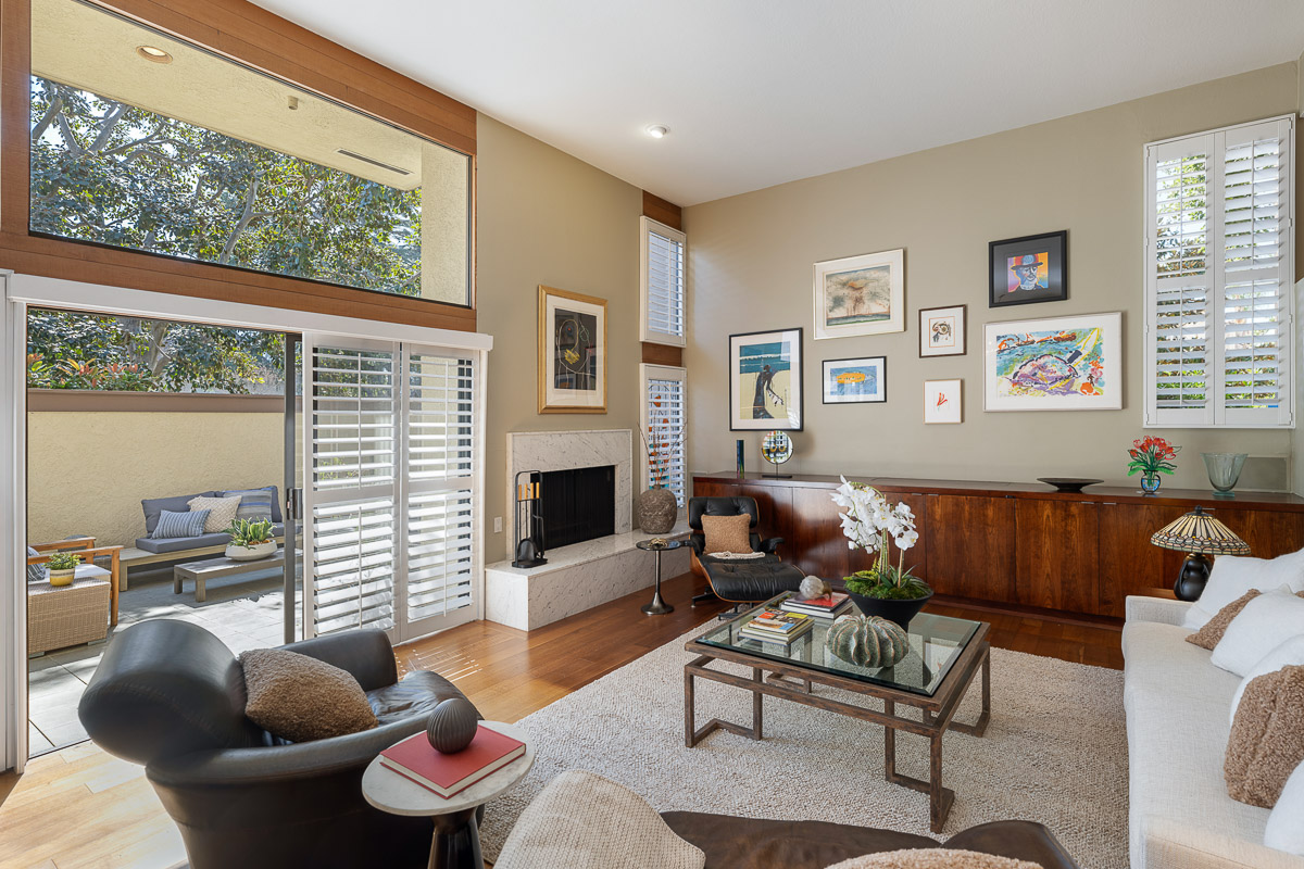 Step inside to find an expansive living room with soaring two-story ceilings, a stately, central fireplace and an adjoining, spacious patio that is ideal for entertaining friends, dining under the starts or simply relaxing with your morning coffee. The formal dining room opens to the remodeled kitchen with high-end appliances, a peninsula with seating and ample cabinet space. A cozy den has tall glass doors, that lead out to a wide side patio that overlooks the verdant Defender’s Park below. The space makes for a perfect reading nook, TV lounge, or home office. The sumptuous primary suite includes its own fireplace, a luxurious updated bath, a custom walk-in closet, and access to a second balcony with views that frame the natural surrounding beauty while offering zen-like privacy. The additional light-filled, bedroom offers an en-suite bath which is perfect for visiting guests.